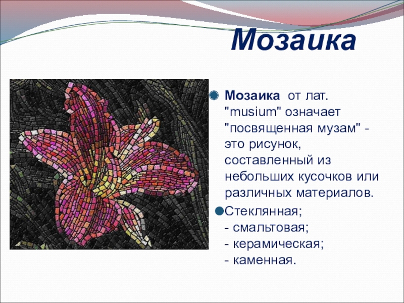 Слайд 9Мозаика от лат. "musium" означает "посвященная музам" - это рисунок,