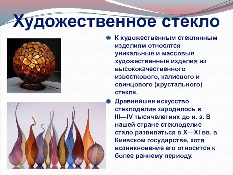 К художественным стеклянным изделиям относятся уникальные и массовые художественные