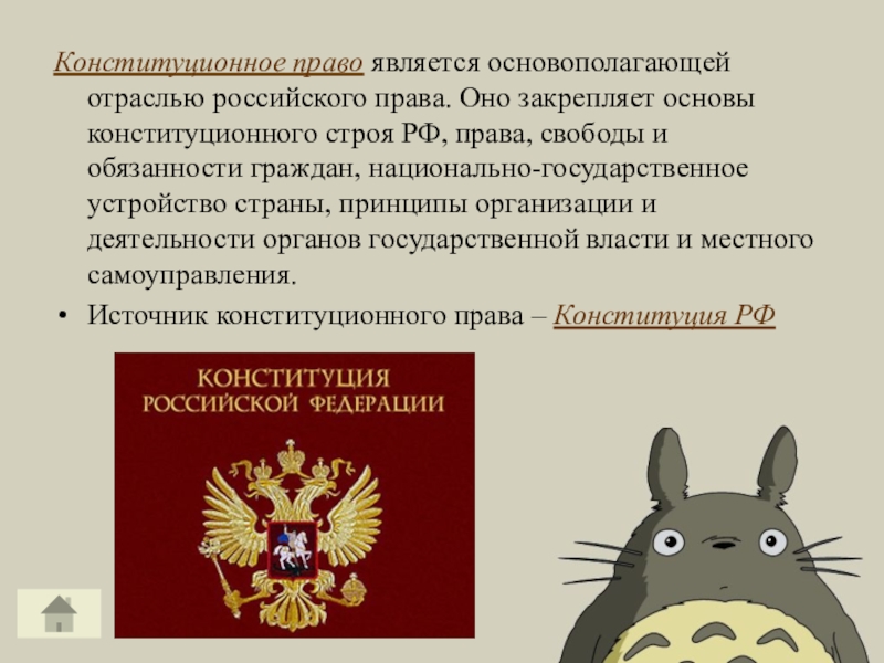 Слайд 4Конституционное право является основополагающей отраслью российского права. Оно закрепляет основы