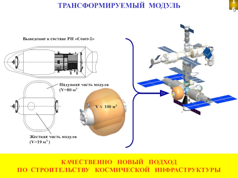 Трансформируемый модуль – прототип перспективных обитаемых космических модулей, обеспечивающий существенное увеличение гермообъема при традиционных стартовых габаритах, эффективную защиту от ионизирующего излучения и микрометеороидов