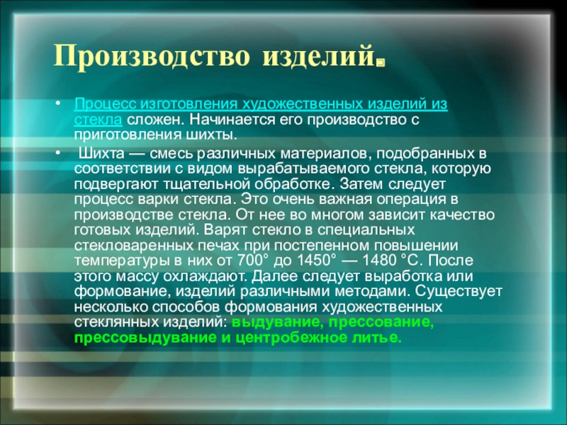соответствии с видом вырабатываемого стекла, которую подвергают тщательной обработке. Затем следует процесс варки стекла. Это очень важная операция в производстве стекла. От нее во многом зависит качество готовых изделий. Варят стекло в специальных стекловаренных печах при постепенном повышении температуры в них от 700° до 1450° — 1480 °С. После этого массу охлаждают. Далее следует выработка или формование, изделий различными методами. Существует несколько способов формования художественных стеклянных изделий: выдувание, прессование, прессовыдувание и центробежное литье.