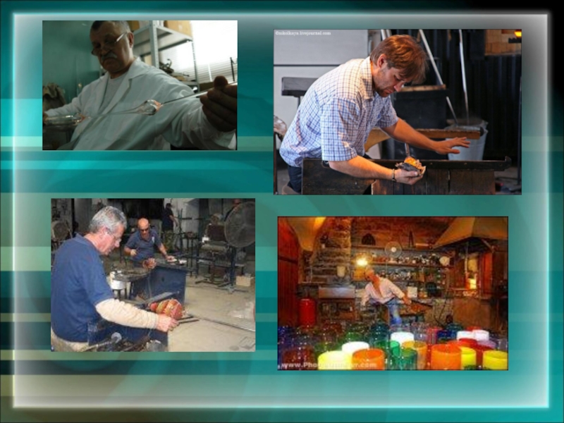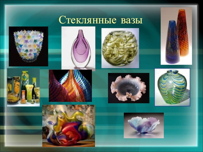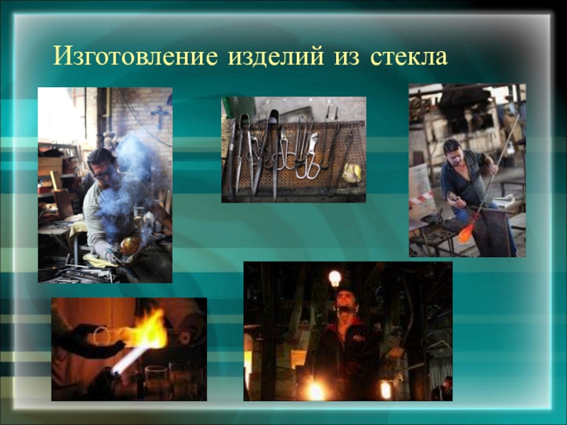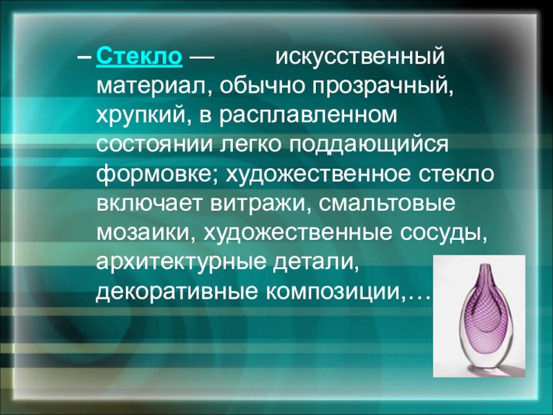 Слайд 5Стекло — искусственный материал, обычно прозрачный, хрупкий, в расплавленном состоянии