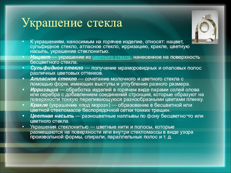 стекло, атласное стекло, ирризацию, кракле, цветную насыпь, украшение стеклонитью.