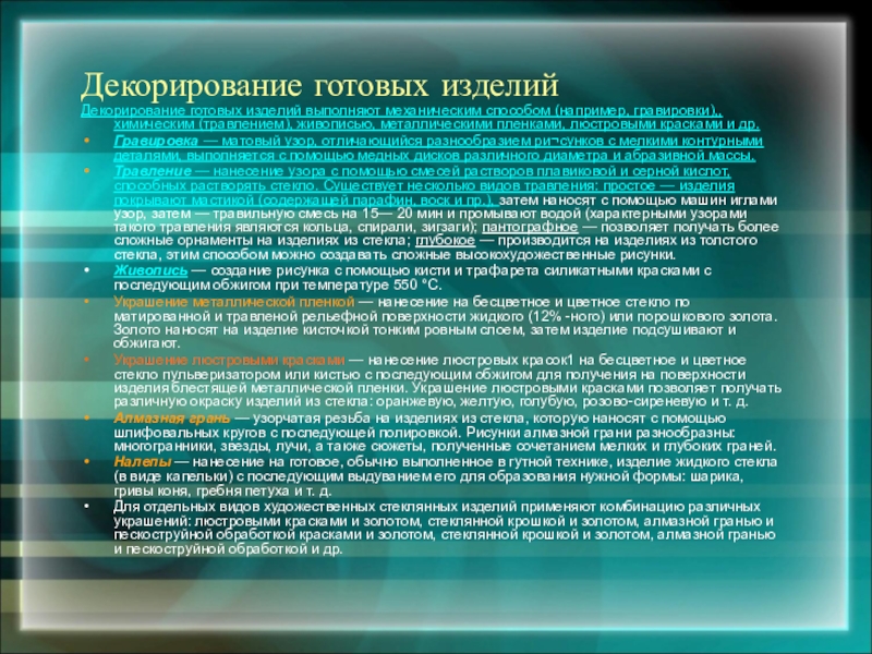 химическим (травлением), живописью, металлическими пленками, люстровыми красками и др.