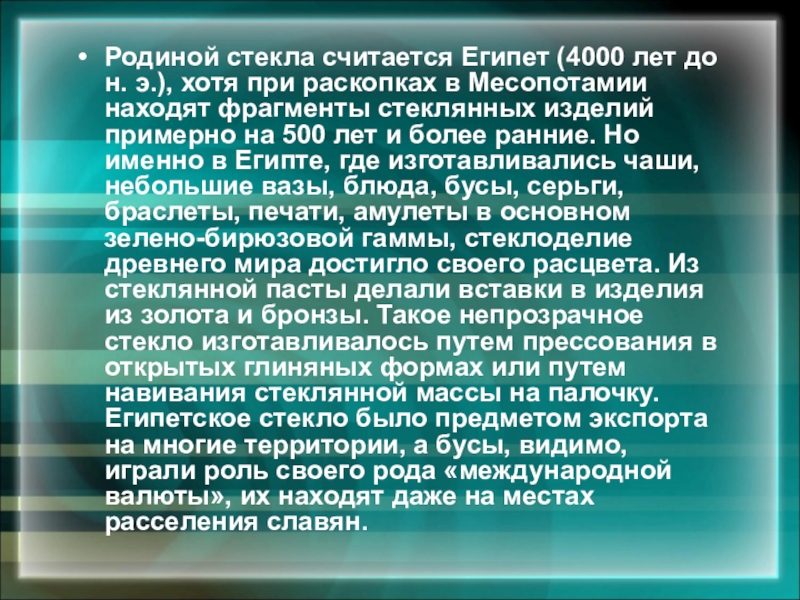 500 лет и более ранние. Но именно в Египте, где изготавливались чаши, небольшие вазы, блюда, бусы, серьги, браслеты, печати, амулеты в основном зелено-бирюзовой гаммы, стеклоделие древнего мира достигло своего расцвета. Из стеклянной пасты делали вставки в изделия из золота и бронзы. Такое непрозрачное стекло изготавливалось путем прессования в открытых глиняных формах или путем навивания стеклянной массы на палочку. Египетское стекло было предметом экспорта на многие территории, а бусы, видимо, играли роль своего рода «международной валюты», их находят даже на местах расселения славян.