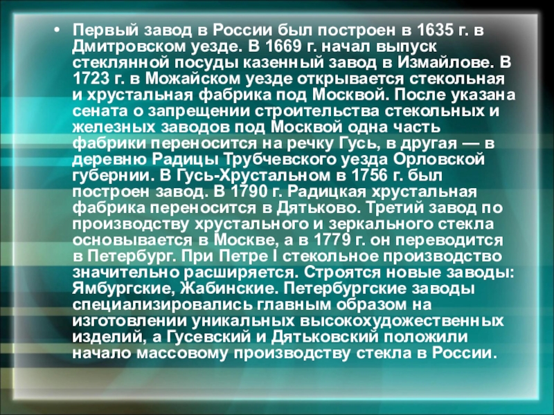 завод в Измайлове. В 1723 г. в Можайском уезде открывается стекольная и хрустальная фабрика под Москвой. После указана сената о запрещении строительства стекольных и железных заводов под Москвой одна часть фабрики переносится на речку Гусь, в другая — в деревню Радицы Трубчевского уезда Орловской губернии. В Гусь-Хрустальном в 1756 г. был построен завод. В 1790 г. Радицкая хрустальная фабрика переносится в Дятьково. Третий завод по производству хрустального и зеркального стекла основывается в Москве, а в 1779 г. он переводится в Петербург. При Петре I стекольное производство значительно расширяется. Строятся новые заводы: Ямбургские, Жабинские. Петербургские заводы специализировались главным образом на изготовлении уникальных высокохудожественных изделий, а Гусевский и Дятьковский положили начало массовому производству стекла в России.