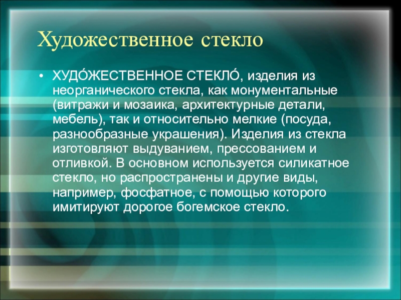 легко поддающийся формовке; художественное стекло включает витражи, смальтовые мозаики, художественные