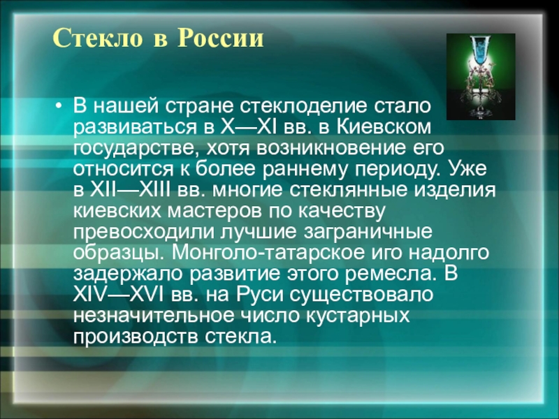 более раннему периоду. Уже в XII—XIII вв. многие стеклянные изделия киевских мастеров по качеству превосходили лучшие заграничные образцы. Монголо-татарское иго надолго задержало развитие этого ремесла. В XIV—XVI вв. на Руси существовало незначительное число кустарных производств стекла.