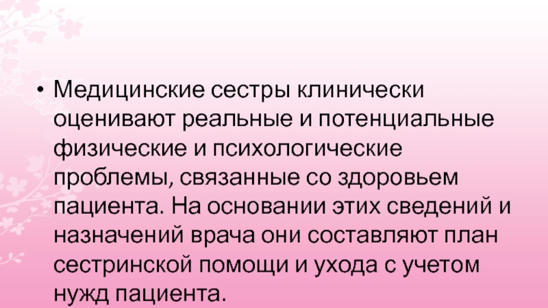 Слайд 7Медицинские сестры клинически оценивают реальные и потенциальные физические и психологические