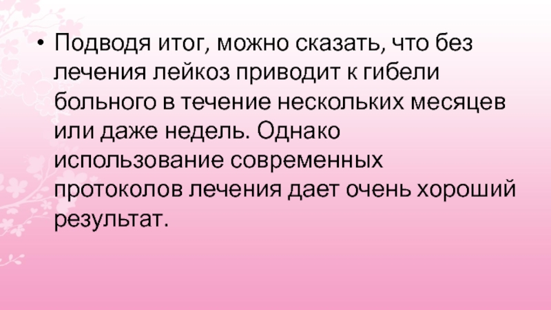 Слайд 10Подводя итог, можно сказать, что без лечения лейкоз приводит к