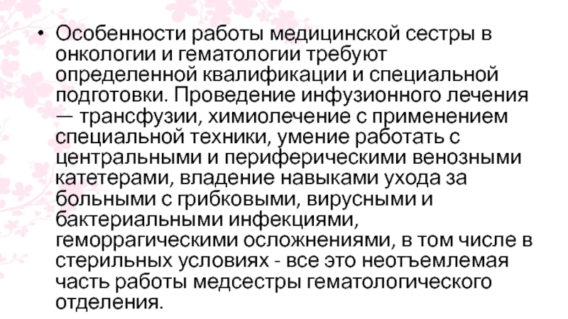 Слайд 6Особенности работы медицинской сестры в онкологии и гематологии требуют определенной