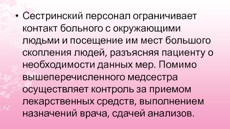 Слайд 9Сестринский персонал ограничивает контакт больного с окружающими людьми и посещение