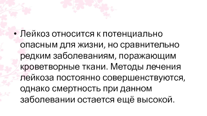 Слайд 3Лейкоз относится к потенциально опасным для жизни, но сравнительно редким
