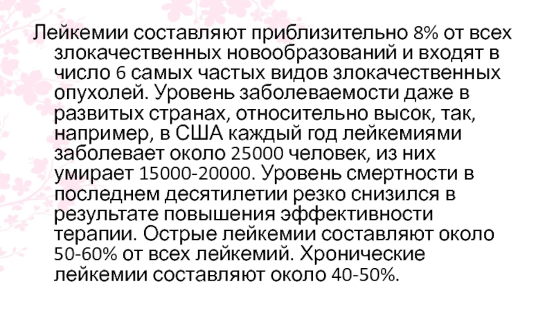 даже в развитых странах, относительно высок, так, например, в США каждый год лейкемиями заболевает около 25000 человек, из них умирает 15000-20000. Уровень смертности в последнем десятилетии резко снизился в результате повышения эффективности терапии. Острые лейкемии составляют около 50-60% от всех лейкемий. Хронические лейкемии составляют около 40-50%.