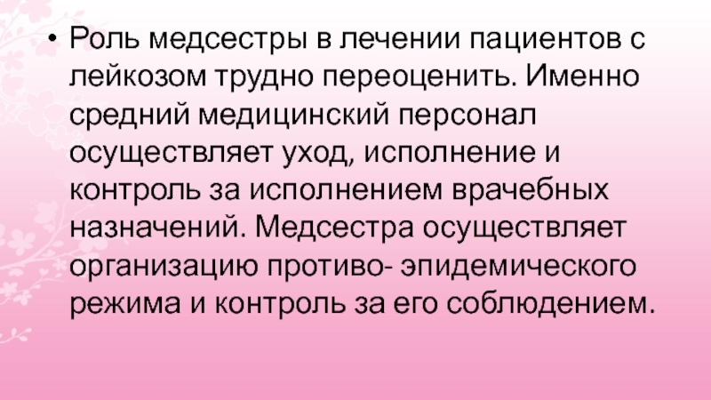 Слайд 8Роль медсестры в лечении пациентов с лейкозом трудно переоценить. Именно