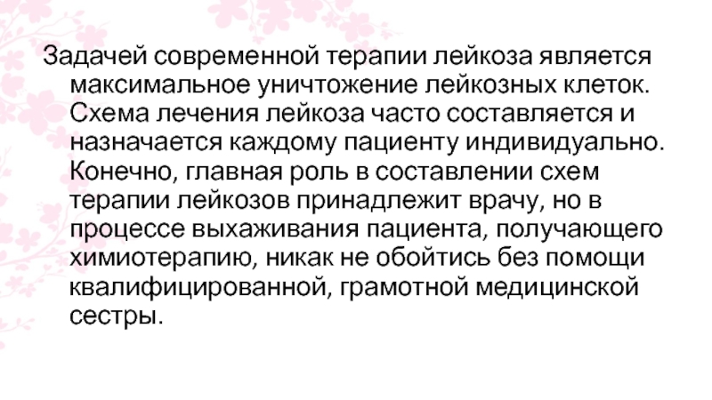 главная роль в составлении схем терапии лейкозов принадлежит врачу, но в процессе выхаживания пациента, получающего химиотерапию, никак не обойтись без помощи квалифицированной, грамотной медицинской сестры.