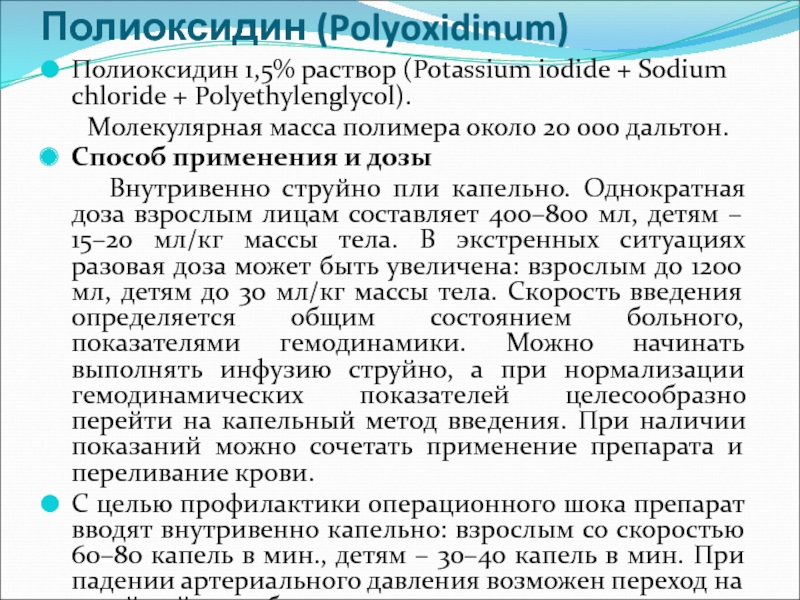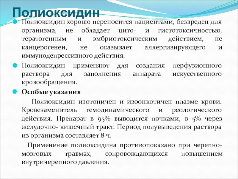 Полиоксидин изотоничен и изоонкотичен плазме крови. Кровезаменитель гемодинамического и реологического действия. Препарат в 95% выводится почками, в 5% через желудочно- кишечный тракт. Период полувыведения раствора из организма составляет 8 ч.