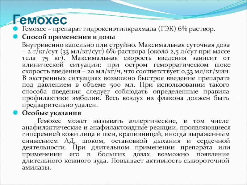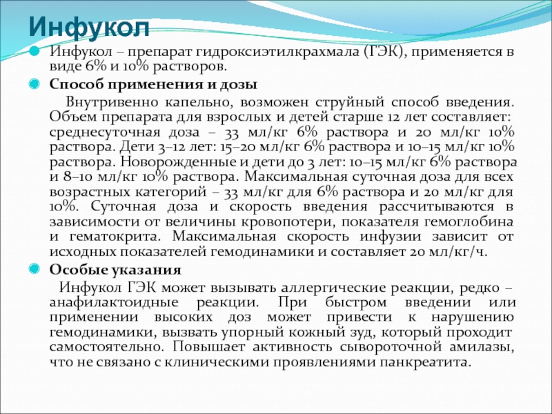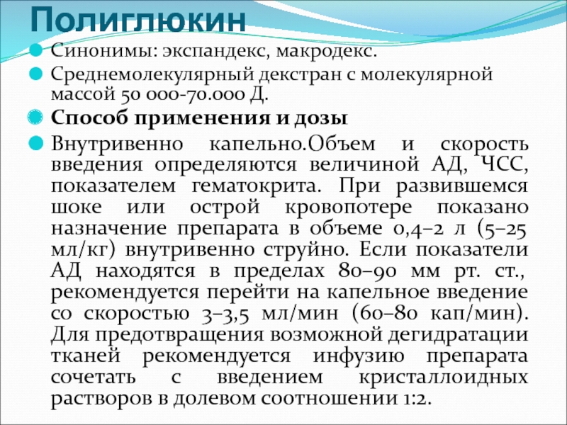 ЧСС, показателем гематокрита. При развившемся шоке или острой кровопотере показано назначение препарата в объеме 0,4–2 л (5–25 мл/кг) внутривенно струйно. Если показатели АД находятся в пределах 80–90 мм рт. ст., рекомендуется перейти на капельное введение со скоростью 3–3,5 мл/мин (60–80 кап/мин). Для предотвращения возможной дегидратации тканей рекомендуется инфузию препарата сочетать с введением кристаллоидных растворов в долевом соотношении 1:2.