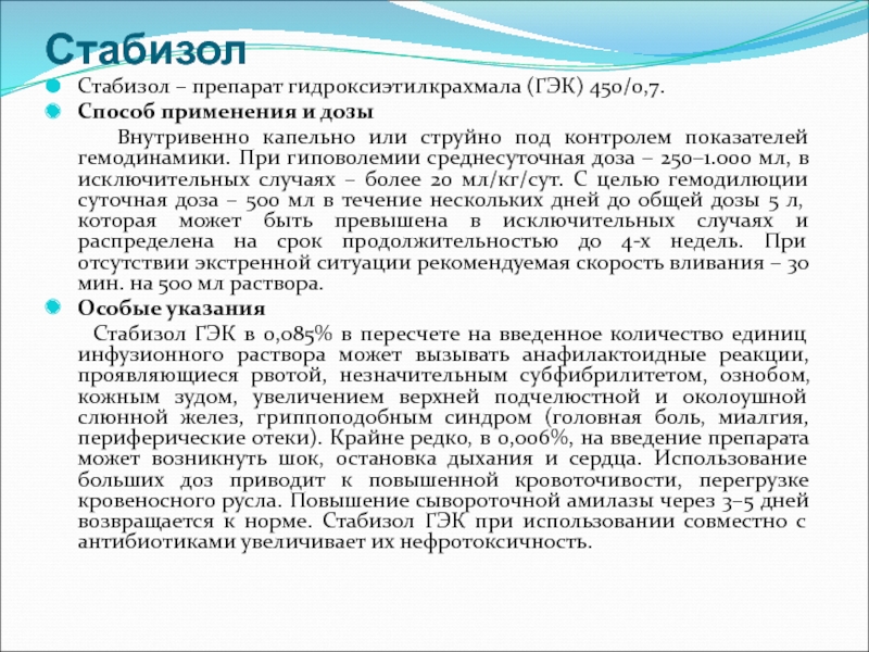 гиповолемии – 250–1.000 мл. Рекомендуемая скорость инфузии составляет на 30 мин. 500 мл раствора. Так же как стабизол, в исключительных случаях дозу препарата можно увеличить до 20 мл/кг/су т.