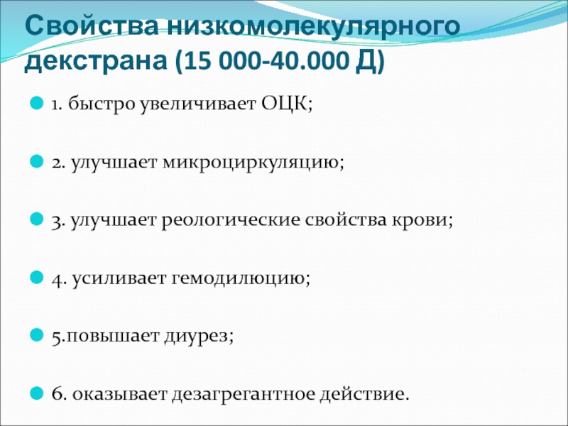 Слайд 5Свойства низкомолекулярного декстрана (15 000-40.000 Д)