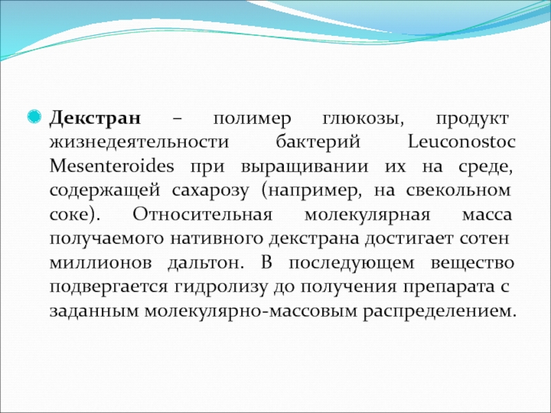 Слайд 4Декстран – полимер глюкозы, продукт жизнедеятельности бактерий Leuconostoc Mesenteroides при