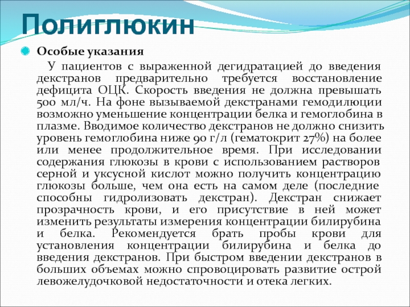 превышать 500 мл/ч. На фоне вызываемой декстранами гемодилюции возможно уменьшение концентрации белка и гемоглобина в плазме. Вводимое количество декстранов не должно снизить уровень гемоглобина ниже 90 г/л (гематокрит 27%) на более или менее продолжительное время. При исследовании содержания глюкозы в крови с использованием растворов серной и уксусной кислот можно получить концентрацию глюкозы больше, чем она есть на самом деле (последние способны гидролизовать декстран). Декстран снижает прозрачность крови, и его присутствие в ней может изменить результаты измерения концентрации билирубина и белка. Рекомендуется брать пробы крови для установления концентрации билирубина и белка до введения декстранов. При быстром введении декстранов в больших объемах можно спровоцировать развитие острой левожелудочковой недостаточности и отека легких.