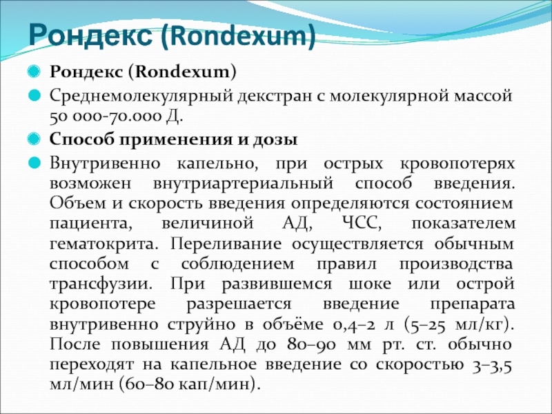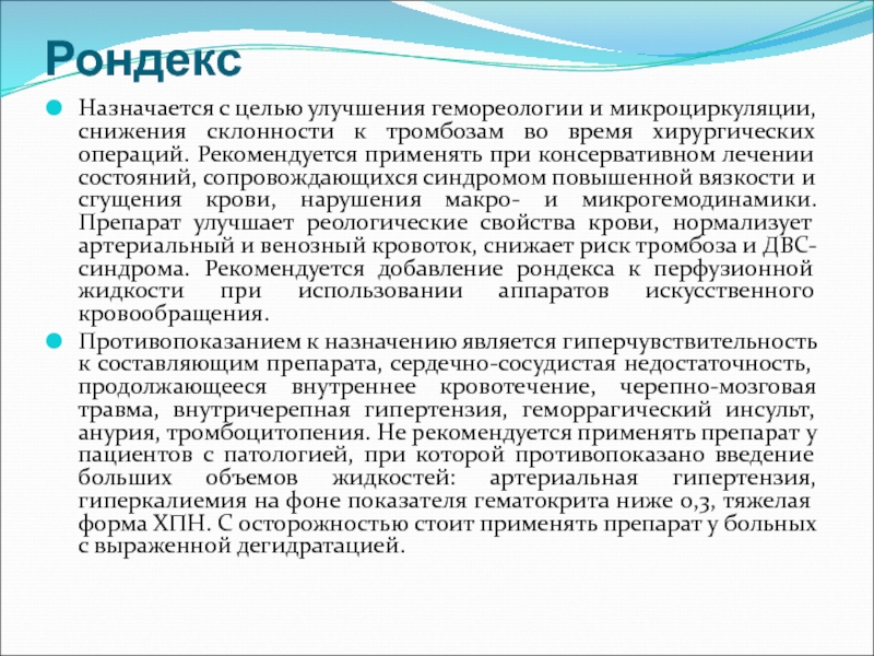 состояний, сопровождающихся синдромом повышенной вязкости и сгущения крови, нарушения макро- и микрогемодинамики. Препарат улучшает реологические свойства крови, нормализует артериальный и венозный кровоток, снижает риск тромбоза и ДВС-синдрома. Рекомендуется добавление рондекса к перфузионной жидкости при использовании аппаратов искусственного кровообращения.