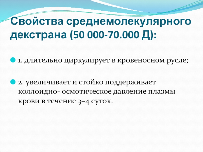 Слайд 6Свойства среднемолекулярного декстрана (50 000-70.000 Д):