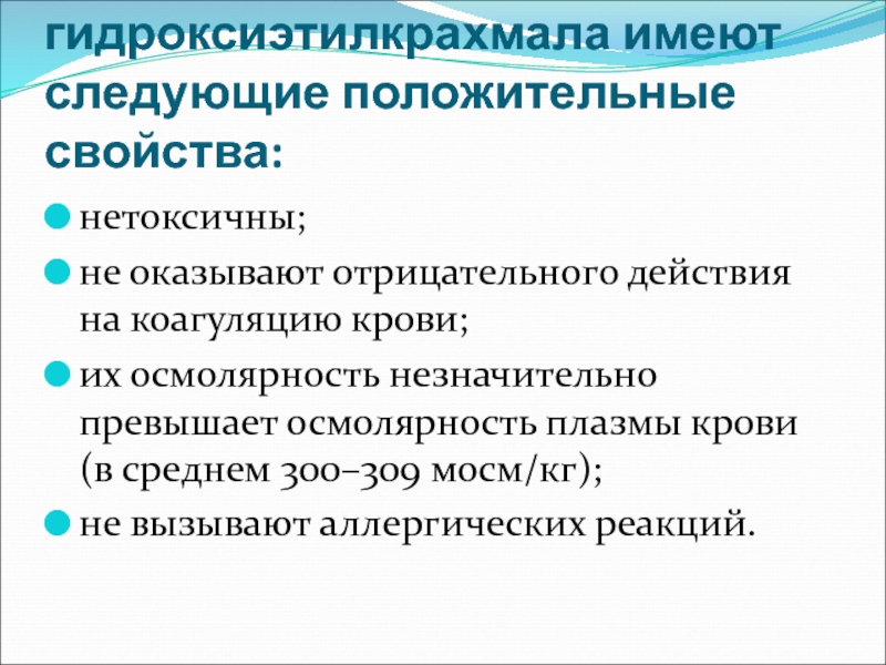 Слайд 29Растворы гидроксиэтилкрахмала имеют следующие положительные свойства: