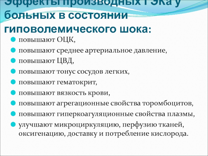 Слайд 30Эффекты производных ГЭКа у больных в состоянии гиповолемического шока:
