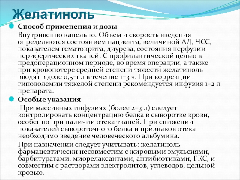 состояния перфузии периферических тканей. С профилактической целью в предоперационном периоде, во время операции, а также при кровопотере средней степени тяжести желатиноль вводят в дозе 0,5–1 л в течение 1–3 ч. При коррекции гиповолемии тяжелой степени рекомендуется инфузия 1–2 л препарата.