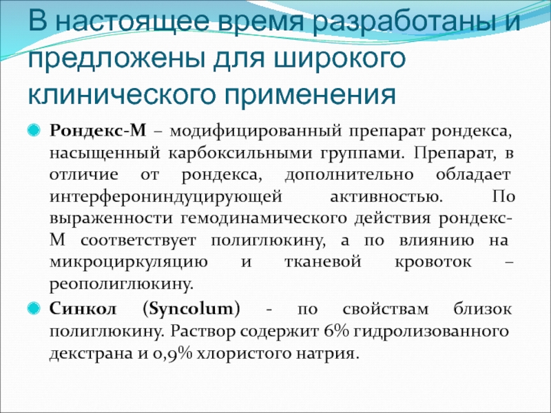 2.Рондекс – гиперосмотический раствор с осмолярностью 0,34–0,37 ммоль/кг., оказывает плазмозамещающее, противошоковое, восполняющее объем ОЦК и антиагрегантное действие.