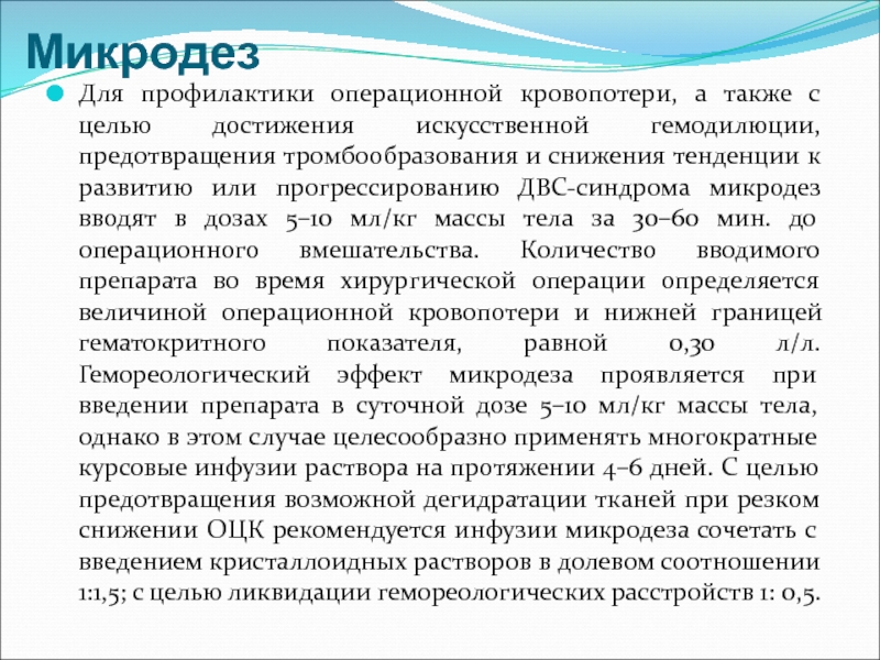 ДВС-синдрома микродез вводят в дозах 5–10 мл/кг массы тела за 30–60 мин. до операционного вмешательства. Количество вводимого препарата во время хирургической операции определяется величиной операционной кровопотери и нижней границей гематокритного показателя, равной 0,30 л/л. Гемореологический эффект микродеза проявляется при введении препарата в суточной дозе 5–10 мл/кг массы тела, однако в этом случае целесообразно применять многократные курсовые инфузии раствора на протяжении 4–6 дней. С целью предотвращения возможной дегидратации тканей при резком снижении ОЦК рекомендуется инфузии микродеза сочетать с введением кристаллоидных растворов в долевом соотношении 1:1,5; с целью ликвидации гемореологических расстройств 1: 0,5.