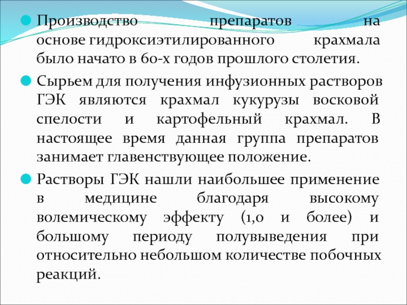 Слайд 28Производство препаратов на основе гидроксиэтилированного крахмала было начато в 60-х годов