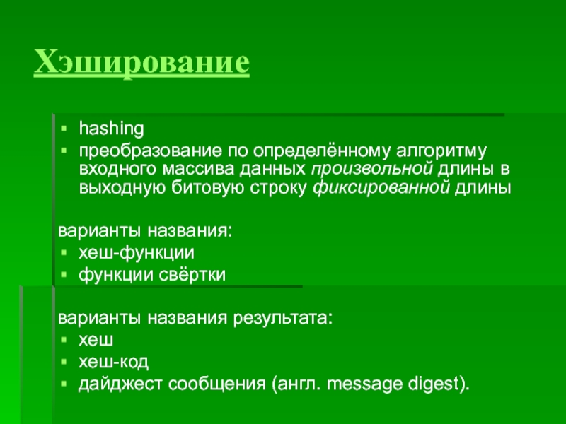 Хеш-функция — функция, которая преобразует сообщение произвольной длины в число («свёртку») фиксированной длины.
