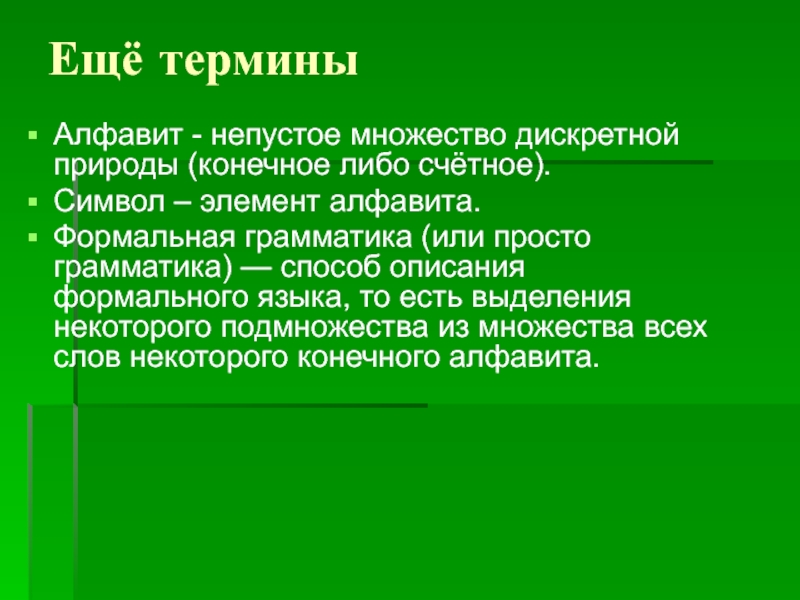 формального языка, то есть выделения некоторого подмножества из множества всех слов некоторого конечного алфавита.