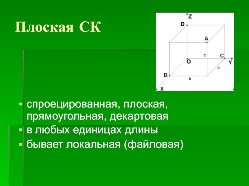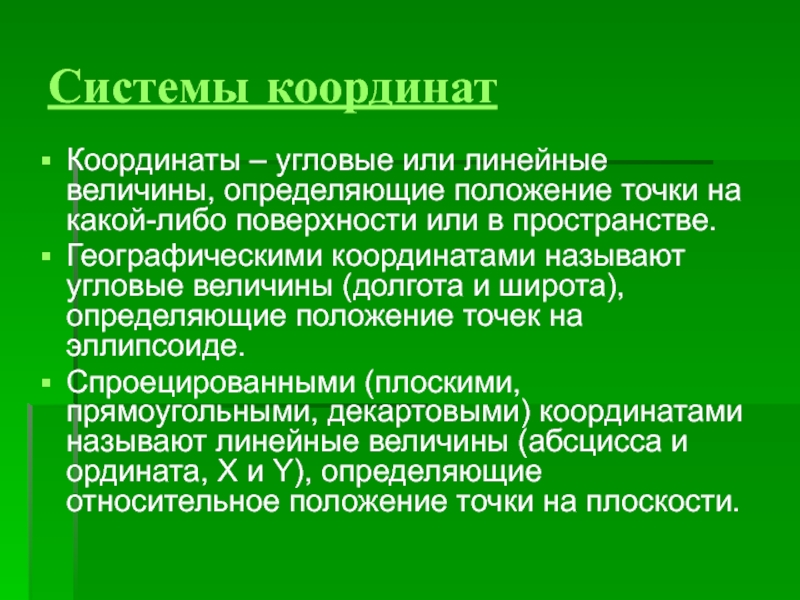 Спроецированными (плоскими, прямоугольными, декартовыми) координатами называют линейные величины (абсцисса и ордината, X и Y), определяющие относительное положение точки на плоскости.