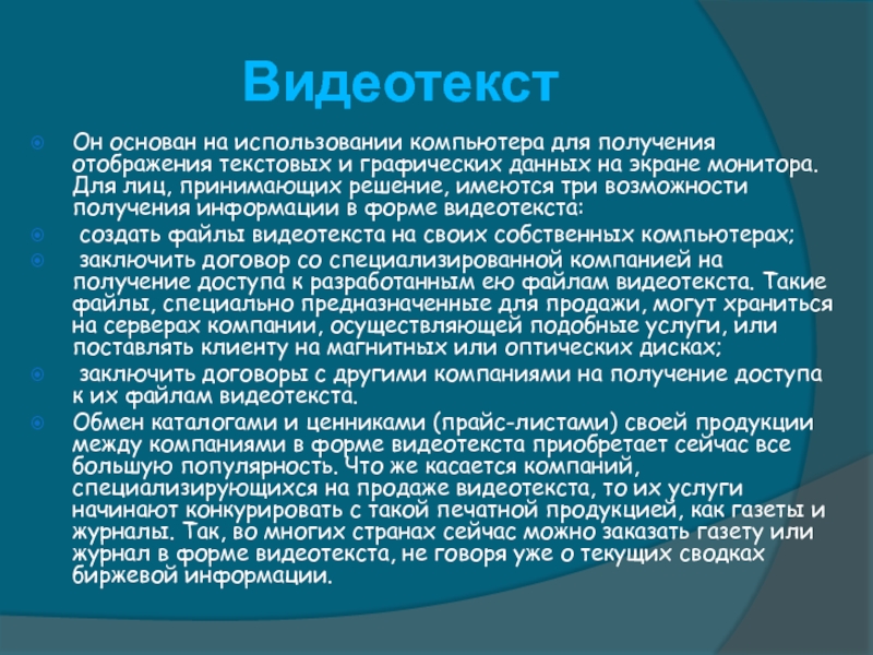 Обмен каталогами и ценниками (прайс-листами) своей продукции между компаниями в форме видеотекста приобретает сейчас все большую популярность. Что же касается компаний, специализирующихся на продаже видеотекста, то их услуги начинают конкурировать с такой печатной продукцией, как газеты и журналы. Так, во многих странах сейчас можно заказать газету или журнал в форме видеотекста, не говоря уже о текущих сводках биржевой информации.
