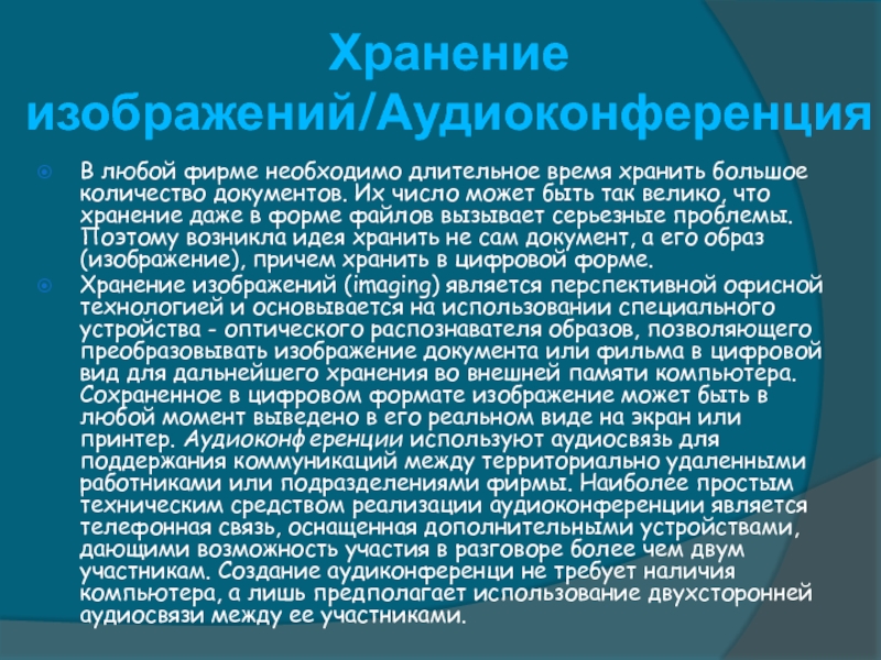 Хранение изображений (imaging) является перспективной офисной технологией и основывается на использовании специального устройства - оптического распознавателя образов, позволяющего преобразовывать изображение документа или фильма в цифровой вид для дальнейшего хранения во внешней памяти компьютера. Сохраненное в цифровом формате изображение может быть в любой момент выведено в его реальном виде на экран или принтер. Аудиоконференции используют аудиосвязь для поддержания коммуникаций между территориально удаленными работниками или подразделениями фирмы. Наиболее простым техническим средством реализации аудиоконференции является телефонная связь, оснащенная дополнительными устройствами, дающими возможность участия в разговоре более чем двум участникам. Создание аудиконференци не требует наличия компьютера, а лишь предполагает использование двухсторонней аудиосвязи между ее участниками.