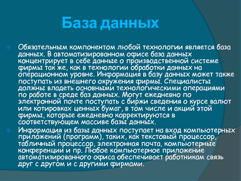 Информация из базы данных поступает на вход компьютерных приложений (программ), таких, как текстовый процессор, табличный процессор, электронная почта, компьютерные конференции и пр. Любое компьютерное приложение автоматизированного офиса обеспечивает работникам связь друг с другом и с другими фирмами.