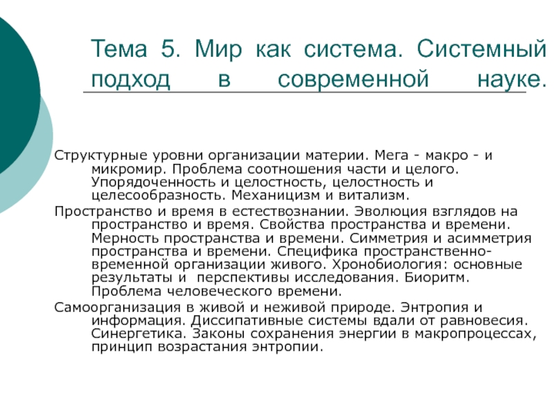 Пространство и время в естествознании. Эволюция взглядов на пространство и время. Свойства пространства и времени. Мерность пространства и времени. Симметрия и асимметрия пространства и времени. Специфика пространственно-временной организации живого. Хронобиология: основные результаты и перспективы исследования. Биоритм. Проблема человеческого времени.