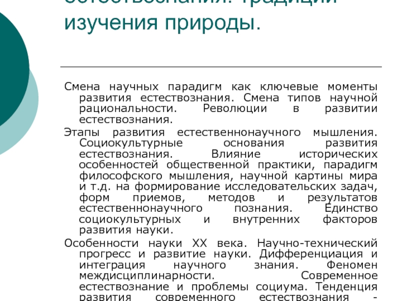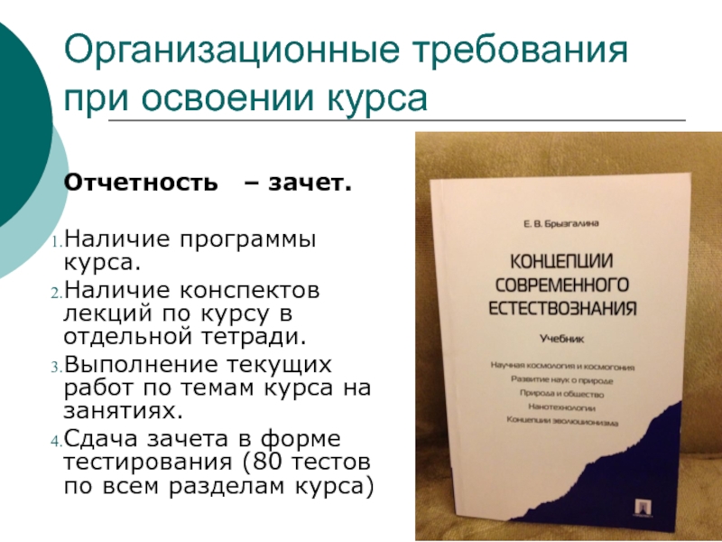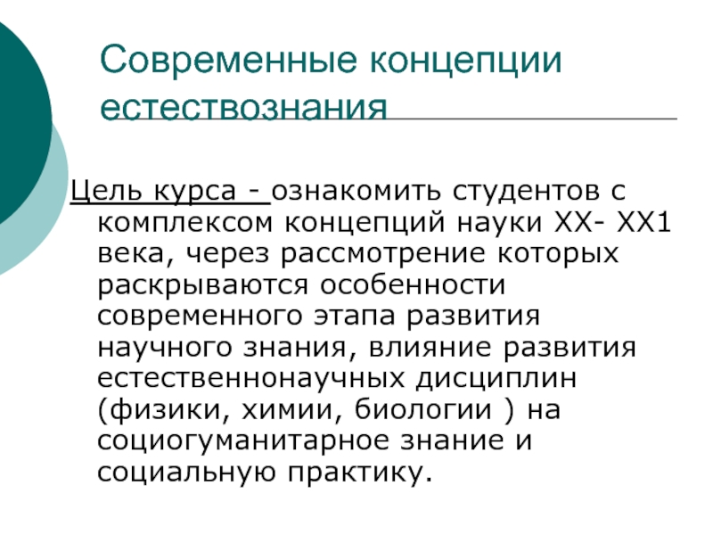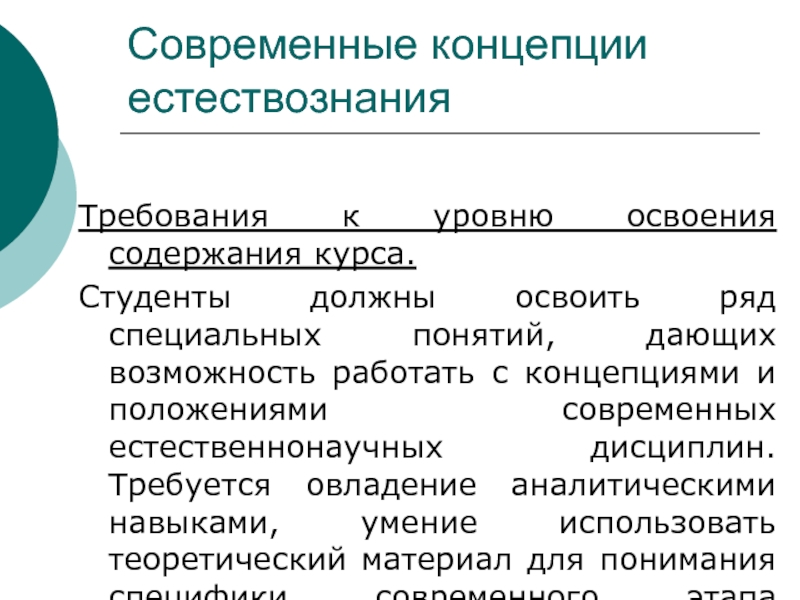 современных естественнонаучных дисциплин. Требуется овладение аналитическими навыками, умение использовать теоретический материал для понимания специфики современного этапа развития науки.