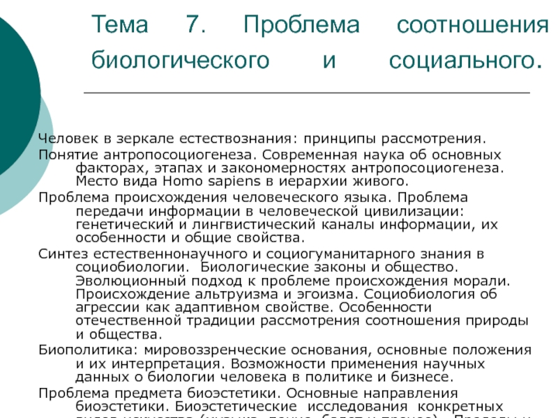 Синтез естественнонаучного и социогуманитарного знания в социобиологии. Биологические законы и общество. Эволюционный подход к проблеме происхождения морали. Происхождение альтруизма и эгоизма. Социобиология об агрессии как адаптивном свойстве. Особенности отечественной традиции рассмотрения соотношения природы и общества.