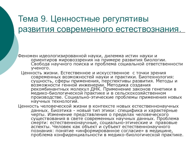 Тема 9. Ценностные регулятивы развития современного естествознания.