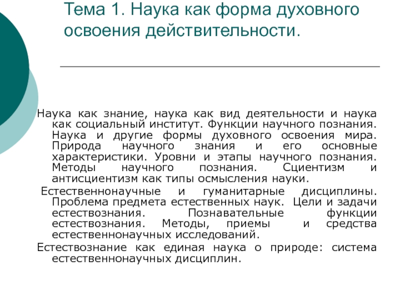 научного познания. Наука и другие формы духовного освоения мира. Природа научного знания и его основные характеристики. Уровни и этапы научного познания. Методы научного познания. Сциентизм и антисциентизм как типы осмысления науки.