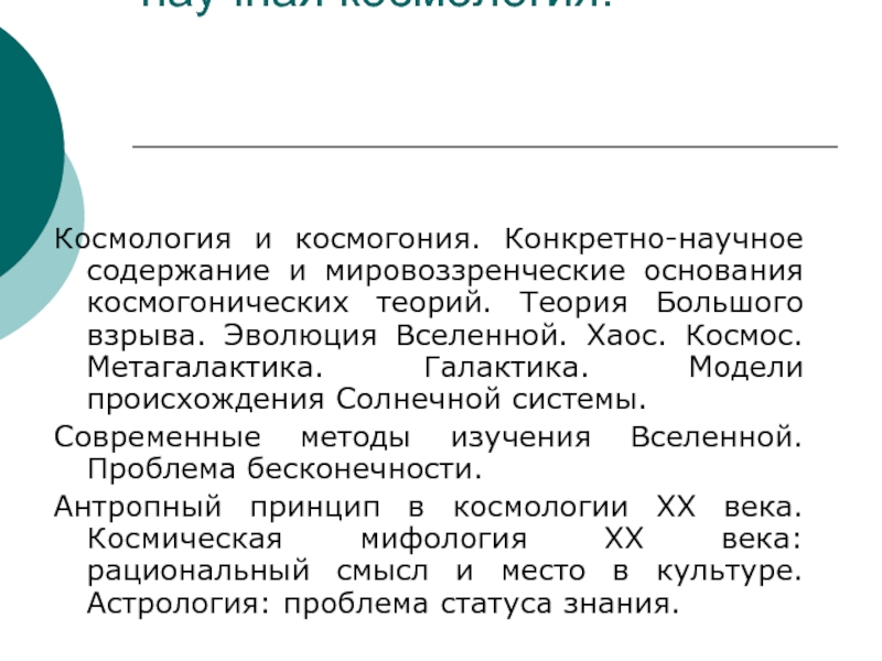 Антропный принцип в космологии ХХ века. Космическая мифология ХХ века: рациональный смысл и место в культуре. Астрология: проблема статуса знания.