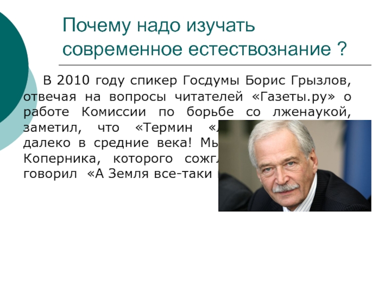 по борьбе со лженаукой, заметил, что «Термин «лженаука» уходит далеко в средние века! Мы можем вспомнить Коперника, которого сожгли за то, что он говорил «А Земля все-таки вертится!»