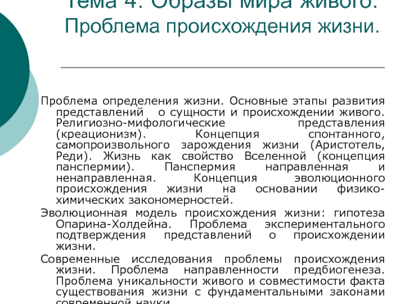 Религиозно-мифологические представления (креационизм). Концепция спонтанного, самопроизвольного зарождения жизни (Аристотель, Реди). Жизнь как свойство Вселенной (концепция панспермии). Панспермия направленная и ненаправленная. Концепция эволюционного происхождения жизни на основании физико-химических закономерностей.