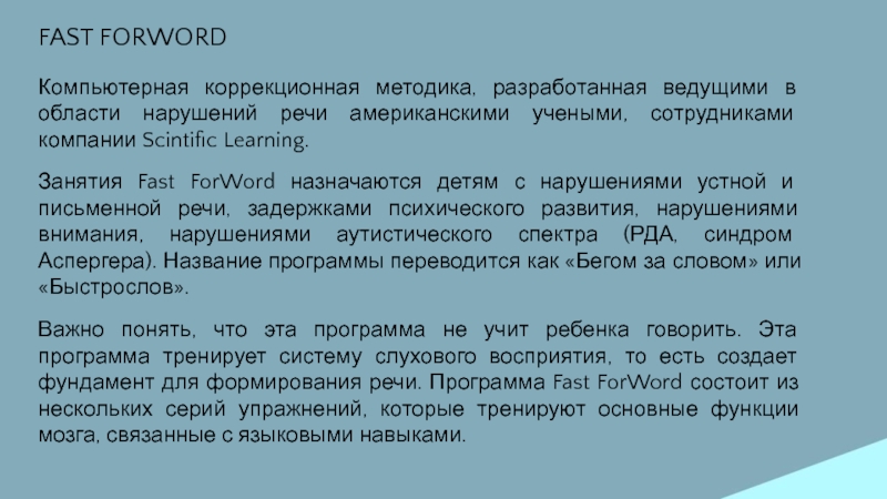 FAST FORWORDКомпьютерная коррекционная методика, разработанная ведущими в области нарушений речи американскими учеными, сотрудниками компании Scintific Learning. Занятия
