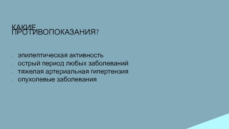 КАКИЕ ПРОТИВОПОКАЗАНИЯ?эпилептическая активностьострый период любых заболеванийтяжелая артериальная гипертензияопухолевые заболевания